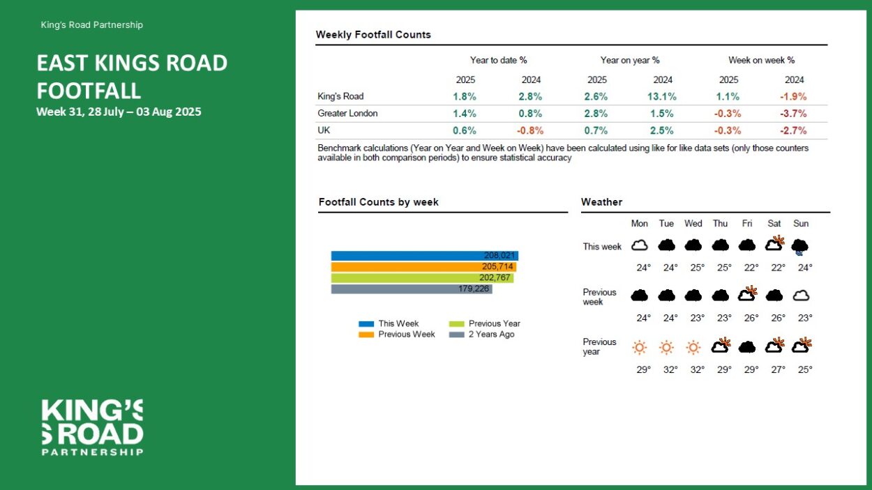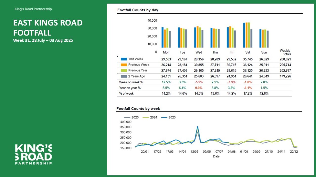 A Footfall Report for King’s Road for Week 31, 2025 (Week commencing 28 July 2025). Download full report (East and West) here