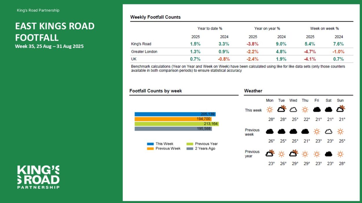 A Footfall Report for King’s Road for Week 35, 2025 (Week commencing 25 Aug 2025). Download full report (East and West) here